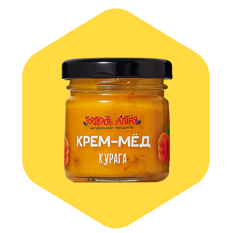 Состав: Крем-мёд (взбитый цветочный мёд из Алтая), натуральная курага (сухофрукт или лиофилизат).
